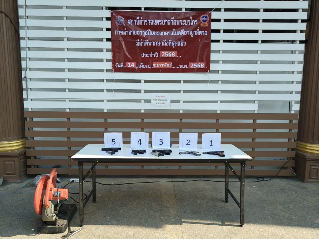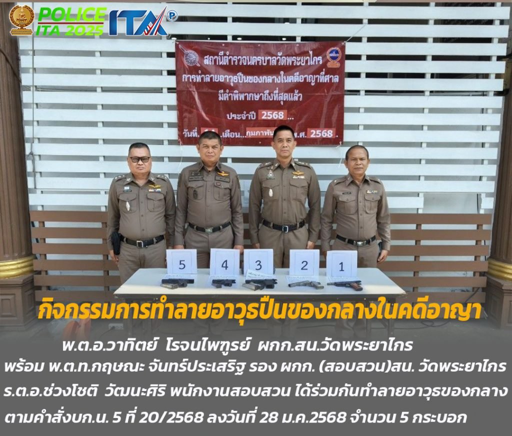 สถานีตำรวจนครบาลวัดพระยาไกร ได้ดำเนินการขับเคลื่อนการประเมินคุณธรรมและความโปร่งใส ในการดำเนินงานของหน่วยงานภาครัฐ (ITA) ของสถานีตำรวจ ประจำปีงบประมาณ พ.ศ. 2568 โดยมี พันตำรวจเอกวาทิตย์ โรจนไพฑูรย์ ผู้กำกับการสถานีตำรวจนครบาลวัดพระยาไกร พร้อม พ.ต.ท.กฤษณะ จันทร์ประเสริฐ รอง ผกก.(สอบสวน)สน.วัดพระยาไกร และพนักงานสอบสวน เจ้าหน้าที่ตำรวจเก็บรักษาของกลางในคดีอาญา ได้ร่วมกันทำลายอาวุธปืนของกลางในคดีอาญา ตามคำสั่ง บก.น. 5 ที่ 20/2568 ลงวันที่ 28 ม.ค. 2568 จำนวน 5 กระบอก ดังนี้