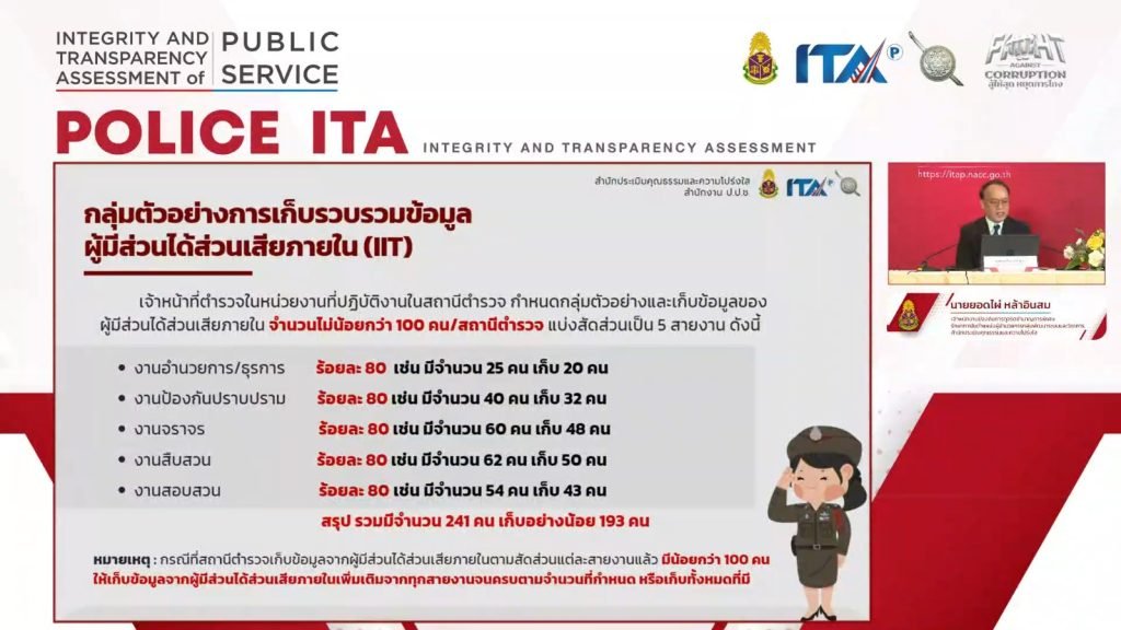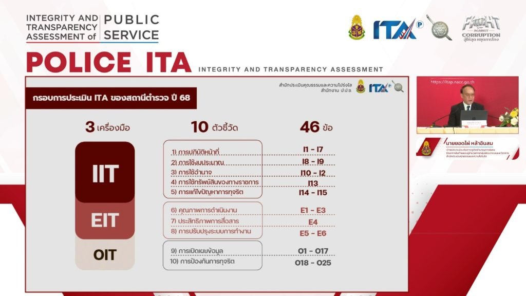 สำนักงาน ป.ป.ช. ได้ตระหนักถึงความสำคัญของการประเมิน ITA ของสถานีตำรวจ ซึ่งถือได้ว่าเป็นการประเมินหน่วยงานที่มีความสำคัญเชิงพื้นที่ และมีความสำคัญเชิงยุทธศาสตร์ด้านการป้องกันและปราบปรามการทุจริต ซึ่งเป็นหน่วยงานที่จำเป็นต้องมุ่งเน้นการยกระดับการให้บริการประชาชน และจำเป็นต้องสะท้อนให้เห็นความโปร่งใสเพื่อให้พี่น้องประชาชนมีความเชื่อถือ เชื่อมั่น การประเมินดังกล่าวก่อให้เกิดการพัฒนาการปฏิบัติงานของตำรวจในหลาย ๆ มิติ และการกำหนดให้สถานีตำรวจเปิดเผยข้อมูลผ่านเว็บไซต์ เพื่อให้สถานีตำรวจมีความโปร่งใสและตรวจสอบได้ ซึ่งสำนักงาน ป.ป.ช. มุ่งหวังเป็นอย่างยิ่งในการช่วยยกระดับค่าคะแนน ITA ของสถานีตำรวจได้อย่างมีประสิทธิภาพ และสร้างภาพลักษณ์ในการส่งเสริมภาพลักษณ์การปฏิบัติราชการของสถานีตำรวจต่อไป