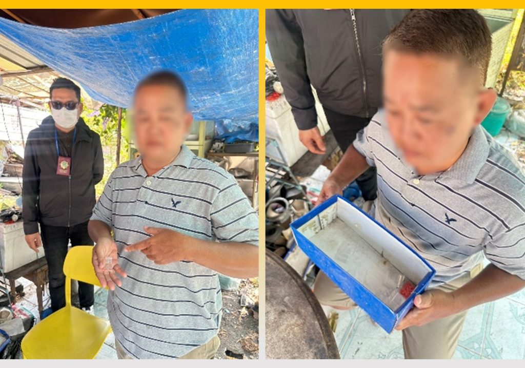 ของกลางรายการที่ 2 ,3 ,4 พบอยู่ในกล่อง โดยกล่องวางอยู่บนชั้นวางรองเท้าภายในเพิงพักที่ผู้ถูกจับกุมนั่งเฝ้าอยู่ ขณะถูกตรวจค้น-จับกุม