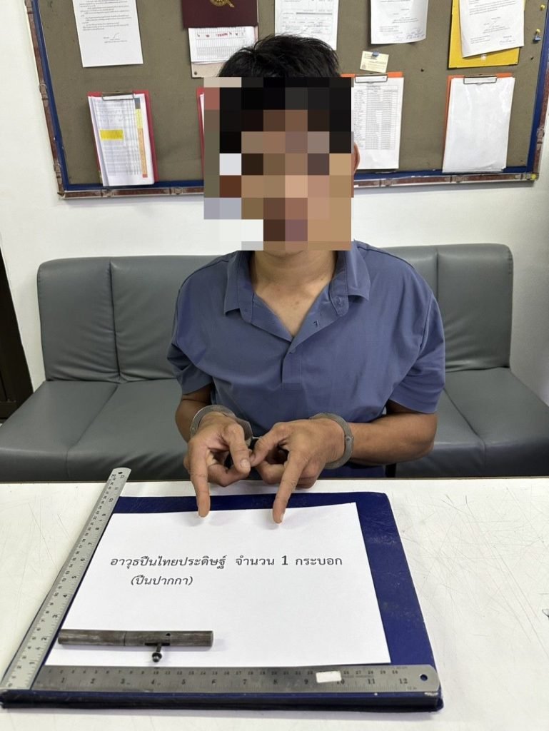 ♦️พร้อมด้วยของกลางมี : อาวุธปืนไทยประดิษฐ์(ปืนปากกา) ขนาด .22 มม. จำนวน 1 กระบอก