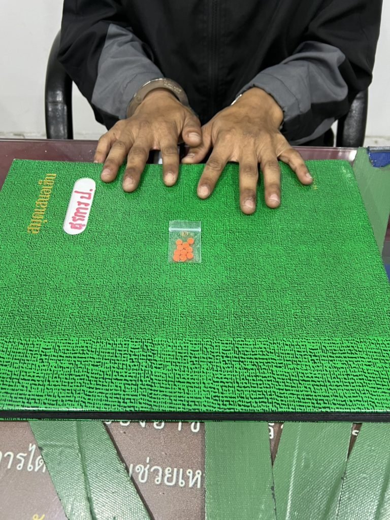 พร้อมด้วยของกลาง 1.ยาเสพติดให้โทษประเภท 1 เมทแอมเฟตามีน(ยาบ้า) ลักษณะเม็ดกลมแบนสีส้มตัวอักษร WY อีกด้านเรียบ บรรจุรวมอยู่ในถุงพลาสติกสีใสแบบกดปิด-ดึงเปิด จำนวน 10 เม็ด จำนวน 1 ถุง