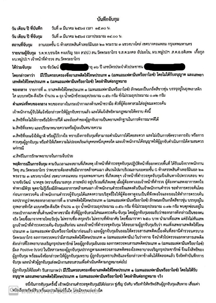 ตามวันเวลาและสถานที่เกิดเหตุเจ้าหน้าที่ตำรวจชุดจับกุมปฏิบัติหน้าที่ออกตรวจพื้นที่ ได้รับแจ้งจากพนักงานวิทยุ สน.วัดพระยาไกร ว่าพบชายต้องสงสัยมีอาการคล้ายคนเมา เดินวนไปมาบริเวณลานจอดรถชั้น G ห้างสรรพสินค้าเทอร์มินอล 21 พระราม 3 แขวงบางโคล่ เขตบางคอแหลม กรุงเทพมหานคร ที่เกิดเหตุฯ เจ้าหน้าที่ตำรวจชุดจับกุมจึงเดินทางไปตรวจสอบ พบนายชัยวัฒน์ นาคสุข (ทราบชื่อนามสกุล ภายหลัง) อยู่บริเวณที่เกิดเหตุ เมื่อผู้ต้องหาเจอเจ้าหน้าที่ตำรวจ ผู้ต้องหาแสดงอาการตกใจ ท่าทางมีพิรุธ พูดจาไม่รู้เรื่องมีลักษณะอาการคล้ายคนเมา เจ้าพนักงานตำรวจจึงแสดงตัวเป็นเจ้าพนักงานตำรวจขอทำการตรวจค้นโดยก่อนการตรวจค้นเจ้าพนักงานตำรวจผู้จับกุมได้แสดงความบริสุทธิ์ใจให้ผู้ต้องหาดูจนเป็นที่พึงพอใจและยอมให้ทำการตรวจค้น ผลปรากฏว่าพบของกลางรายการที่ 1 ยาเสพติดให้โทษประเภท 1 (เมทแอมเฟตามีนหรือยาไอซ์) ลักษณะเป็นเกล็ดสีขาวขุ่น บรรจุอยู่ในถุงพลาสติกใส แบบกดปิด-ดึงเปิด จำนวน 1 ถุง น้ำหนักรวมถุงประมาณ 0.56 กรัม ชั่งไม่รวมถุงประมาณ 0.32 กรัม พบซุกซ่อนอยู่ในกระเป๋ากางเกงขาสั้นด้านหน้าทางขวามือ ตัวที่ผู้ถูกจับสวมใส่ขณะตรวจค้น-จับกุม โดยผู้ถูกจับกุมยอมรับว่าของกลางดังกล่าวเป็นของตนจริง โดยซื้อมาจากชายไทยวัยรุ่น ไม่ทราบชื่อ-สกุลจริง ไม่ทราบที่พักอาศัย โดยซื้อมาราคา 250 บาท นำมาเพื่อเสพ แต่ยังไม่ทันเสพ ถูกเจ้าหน้าที่ตำรวจตรวจค้น-จับกุมเสียก่อน และเจ้าหน้าที่ตำรวจชุดจับกุม ได้สอบถามผู้ถูกจับกุมรับว่า ตนเพิ่งเสพยาเสพติดให้โทษประเภท 1 (เมทแอมเฟตามีนหรือยาไอซ์)มาก่อนแล้ว และผู้ถูกจับกุมยินยอมให้ตรวจสารเสพติดเบื้องต้นที่สถานีตำรวจนครบาลวัดพระยาไกร ผลการตรวจพบว่ามีสารเสพติดให้โทษประเภท 1 (เมทแอมเฟตามีน) ในร่างกาย จึงนำตัวไปตรวจแยกหาสารเสพติดดังกล่าวที่โรงพยาบาลเจริญกรุงประชารักษ์ โดยผู้ถูกจับกุมยินยอม ผลการตรวจพบสารเสพติดประเภท 1 (เมทแอมเฟตามีนหรือยาไอซ์) มีผล Positive (บวก) ในปัสสาวะของผู้ถูกจับกุมปรากฎตามผลตรวจสารเสพติดของโรงพยาบาลเจริญกรุงประชารักษ์ จึงแจ้งสิทธิของผู้ถูกจับกุม พร้อมแจ้งข้อกล่าวหาให้ผู้ถูกจับกุมทราบ ผู้ถูกจับกุมทราบสิทธิและข้อกล่าวหาข้างต้นได้ดีตลอดแล้ว จึงจัดทำบันทึกการจับกุมนำตัวผู้ถูกจับกุมนำส่งพนักงานสอบสวน เพื่อดำเนินการต่อไป