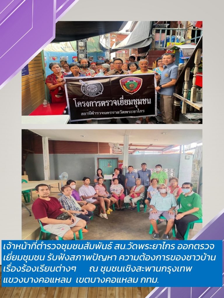 ภายใต้อำนวยการของ พ.ต.อ.วาทิตย์ โรจนไพฑูรย์ ผกก.สน.วัดพระยาไกร นำโดย พ.ต.ท.นิวัฒน์ บรรณสาร รอง ผกก.ป.ฯ สน.วัดพระยาไกร พ.ต.ต.เดชา จำรูญสวัสดิ์ สวป.(ชส.) พร้อมด้วยเจ้าหน้าที่ตำรวจชุมชนสัมพันธ์ สน.วัดพระยาไกร ออกตรวจเยี่ยมชุมชน รับฟังสภาพปัญหา ความต้องการของชาวบ้าน เรื่องร้องเรียนต่างๆ พร้อมกับร่วมกันหารือแนวทางการแก้ไขปัญหายาเสพติด เพื่อหาแนวทางการป้องกันอาชญากรรม สร้างภาคีเครือข่ายในการแจ้งเบาะแสผู้ติดยาเสพติดประชาสัมพันธ์เตือนภัยออนไลน์ และให้ความรู้และวิธีการป้องกันฝุ่นละออง PM 2.5