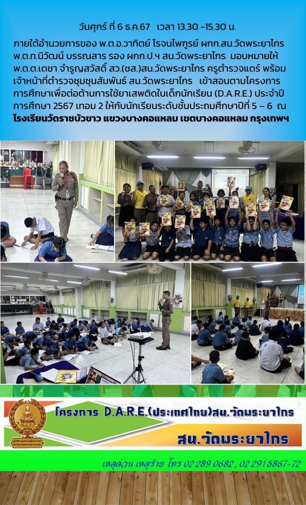 โครงการการศึกษาเพื่อต่อต้านการใช้ยาเสพติดในเด็กนักเรียน (D.A.R.E.) ประจำปีการศึกษา 2567 เทอม 2ให้กับนักเรียนระดับชั้นประถมศึกษาปีที่ 5 – 6 ณ โรงเรียนวัดราชบัวขาว แขวงบางคอแหลม เขตบางคอแหลม กรุงเทพฯ